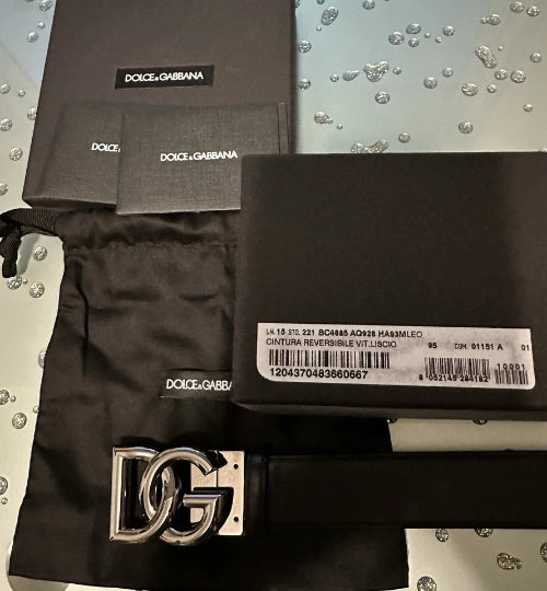 Dolce & Gabbana belt with drawstring bag on a metallic surface