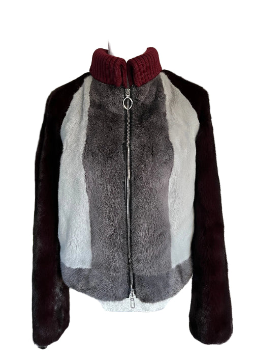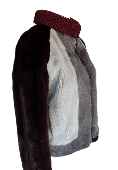 Mannequin wearing a fur jacket with a maroon collar and gray body.